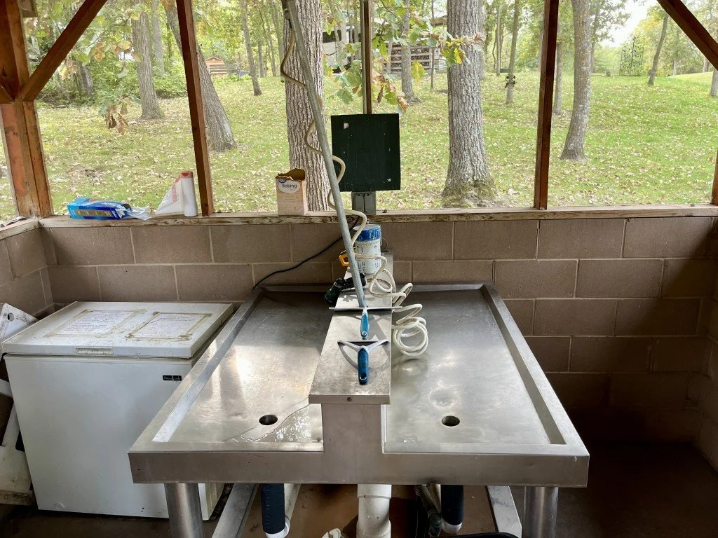 There is a fish cleaning house with a stainless sink.